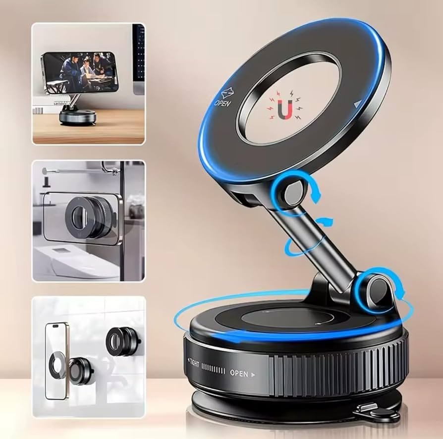 Upgrade your driving experience with this Magnetic Car Phone Mount with MagSafe Compatibility, the perfect solution for safe, hands-free smartphone use in your vehicle. Designed with a powerful magnetic hold, this car phone holder ensures a secure grip, keeping your device stable even on rough roads, sharp turns, or sudden stops. The 360° adjustable rotating design allows you to switch effortlessly between portrait and landscape modes, providing the ideal viewing angle for GPS navigation, calls, and media. Its foldable and space-saving structure offers easy adjustment and convenient storage without cluttering your dashboard or windshield. Featuring a strong suction cup base, this mount firmly attaches to multiple surfaces, delivering long-lasting stability without slipping or leaving residue. This universal magnetic car mount is fully compatible with MagSafe-enabled iPhones (iPhone 15, 14, 13, 12 series) and also supports Android smartphones with a magnetic plate. Built from high-quality, durable materials, it combines strength, reliability, and a sleek modern design, making it an essential car accessory for comfortable, safe, and efficient driving.