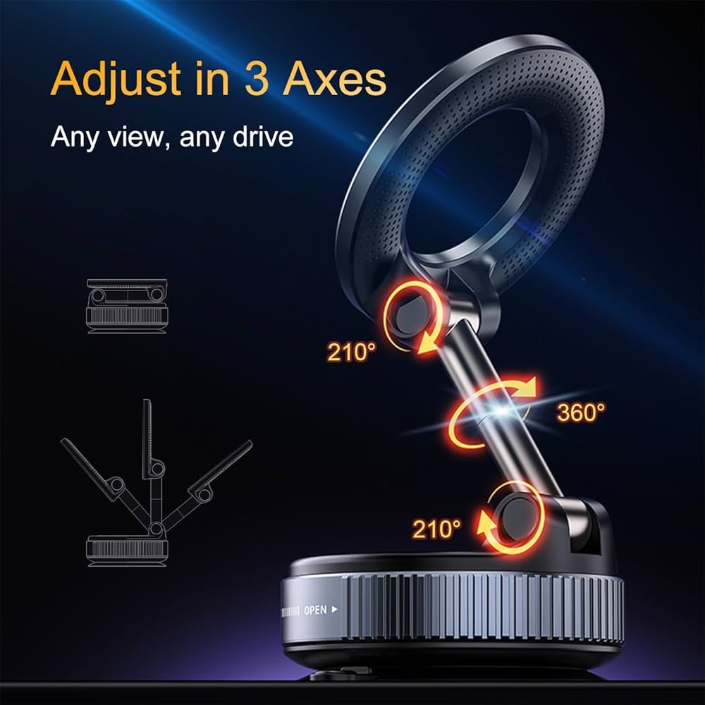 Magnetic Car Phone Mount with MagSafe, 360° Adjustable Foldable Holder, Strong Suction Cup for iPhone & Android Smartphones